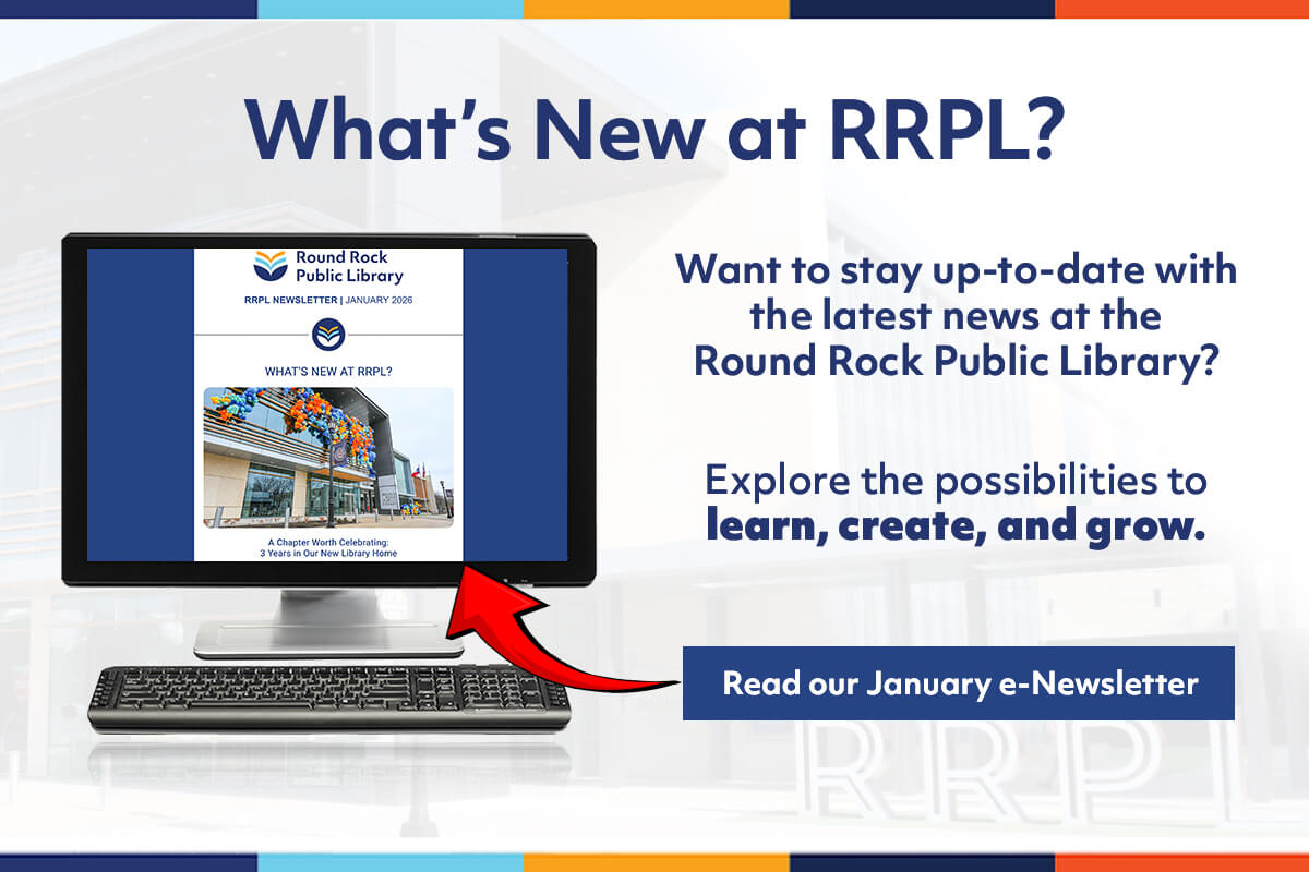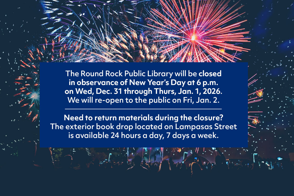 Wednesday, December 31 at 6 p.m. through Thursday, January 1, 2026 | Round Rock Public Library will be closed for New Year's Eve/Day and reopen on Friday, January 2, 2026. Library materials can be returned to the exterior book drop during the closure.