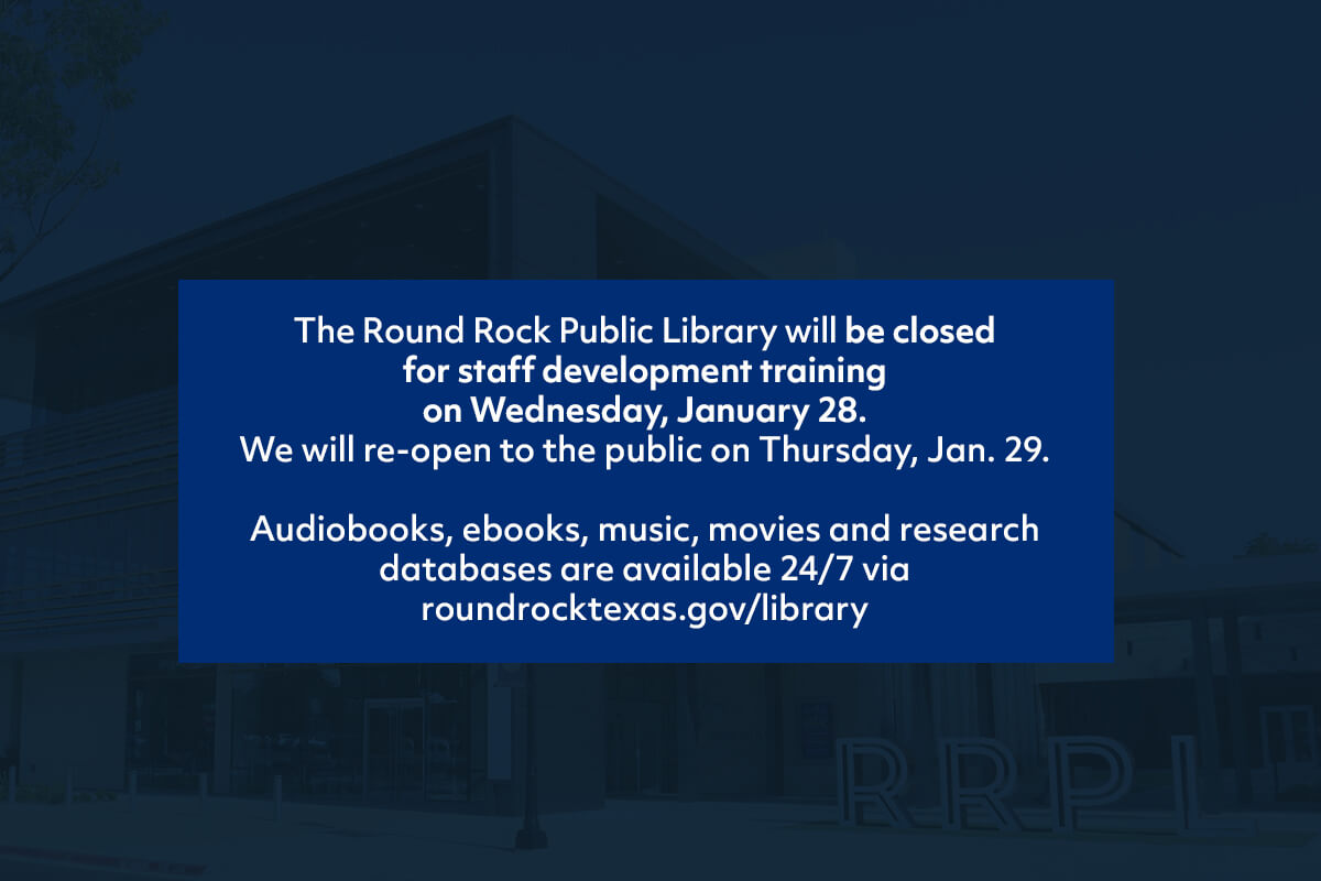 Wednesday, January 28 | Round Rock Public Library will be closed for staff development training and reopen on Thursday, January 29. Library materials can be returned to the exterior book drop during the closure.