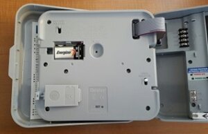 Shown here is the battery location on a Hunter brand controller. A 9-volt battery fits behind the control panel.