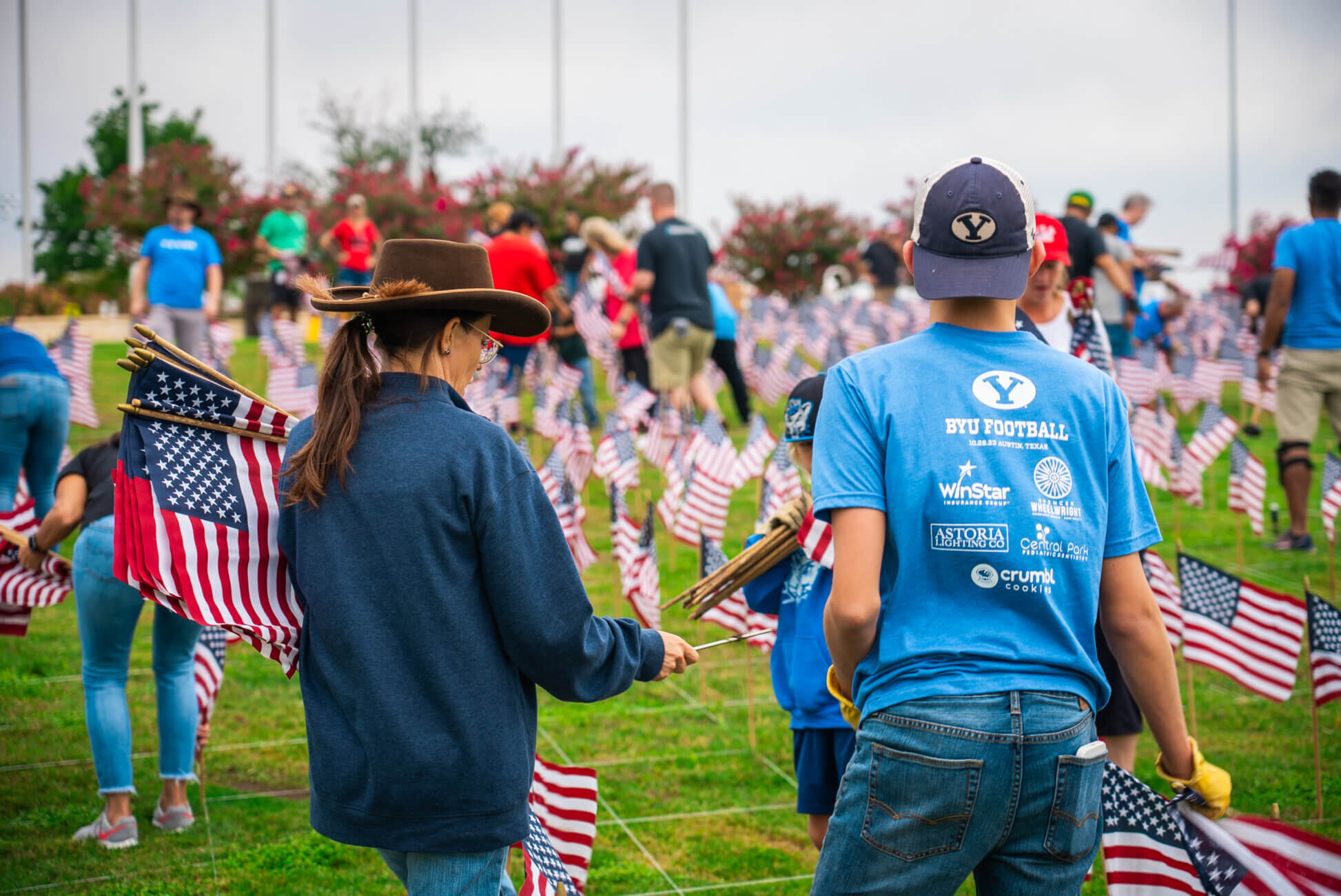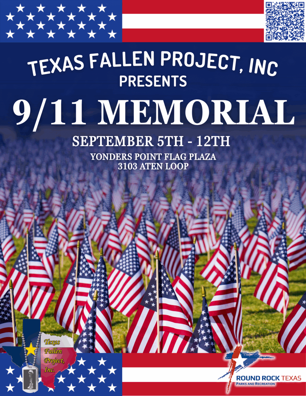 On September 5th, the Friday before 9/11, The Texas Fallen Project, Inc. will begin placing 4,000 12″ x 18″ American Flags out at Flag Plaza at Yonders Point in Old Settlers Park to honor those who have gone on before us. There will be 2977 flags, one for each of the American lives that were lost on 9/11. The remaining 1023 flags will represent Texans we have lost since 9/11. Yonders Point is located at 3103 Aten Loop.