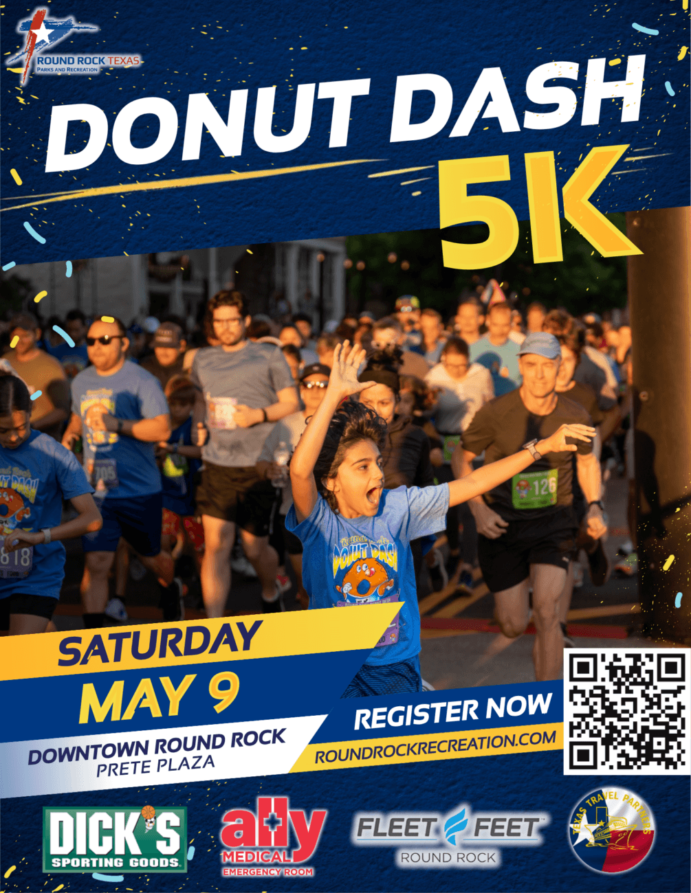 Accept the ultimate donut challenge and join us for the 8th Annual Round Rock Donut Dash 5K on Saturday, May 9th, 2026. Warm up for the race at 6:45am at the starting line to get ready for a whirlwind of fun. Race starts in Downtown Round Rock at 7:00AM (No LATE start past 7:05am). In this unique event you’ll refuel with a mid-point pit stop for a donut (or a dozen!) from your favorite local donut shop. Join us for the post race after party at the finish line!
