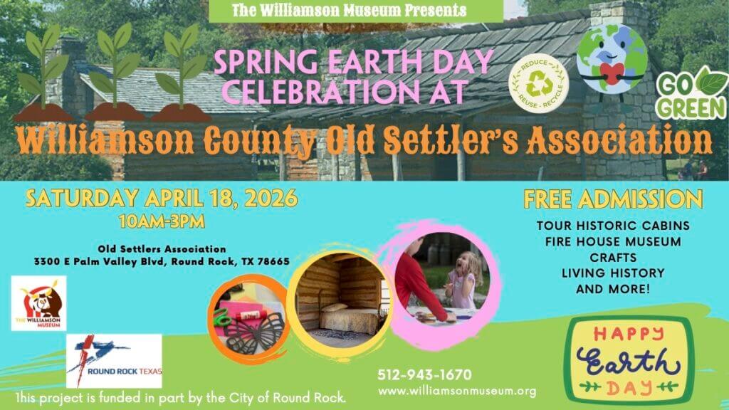 Celebrate Earth Day with The Williamson Museum at Old Settler’s Association in Round Rock on Saturday, April 18, 2026, from 10:00 AM – 3:00 PM. This is a free event that will feature fun crafts, activities and more that center around the conservation and protection of the planet for the whole family. Come enjoy this magnificent holiday with us!