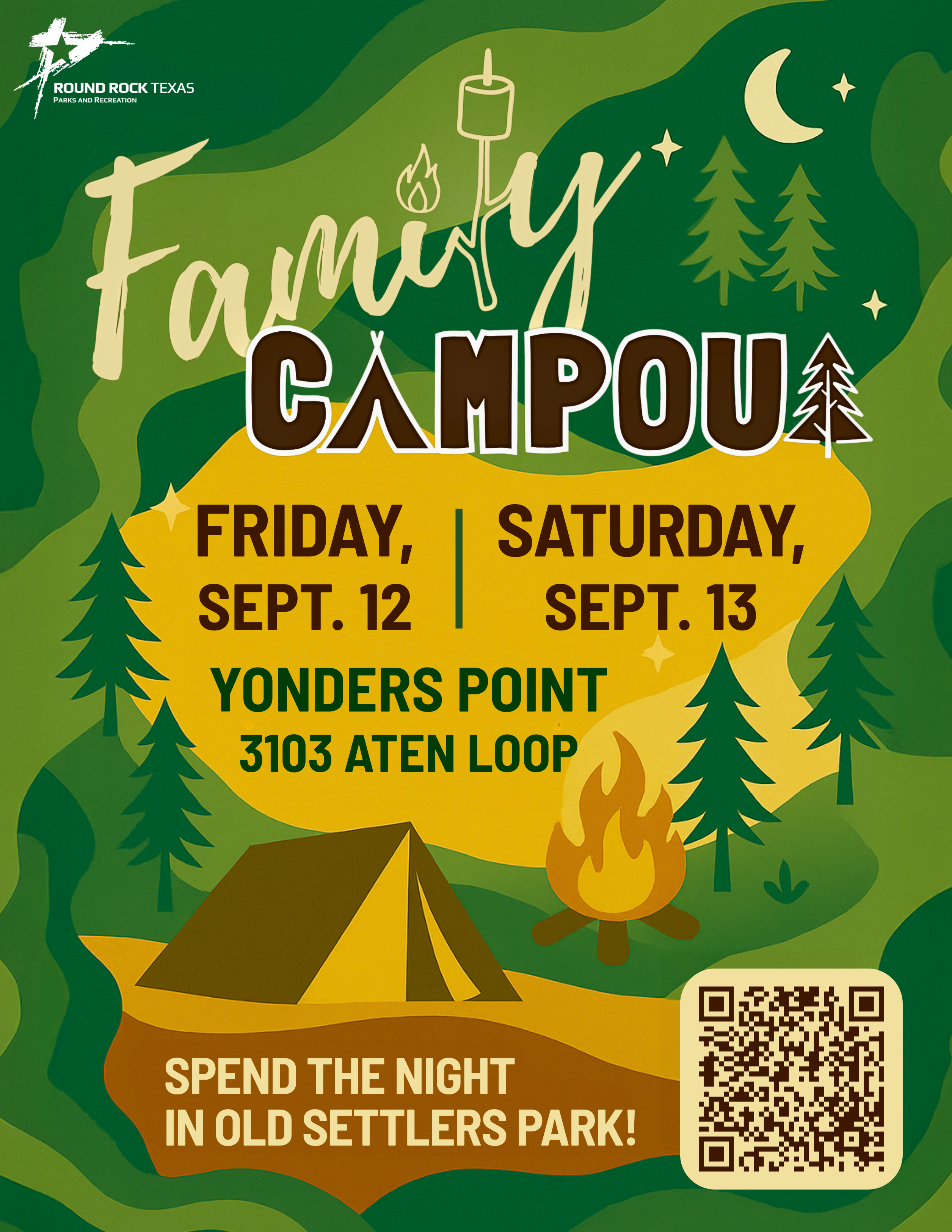 The City of Round Rock’s Parks and Recreation Department presents the 13th annual Family Campout on Friday, Sept. 12th through Saturday, Sept. 13th at Yonders Point in Old Settlers Park (3103 Aten Loop).