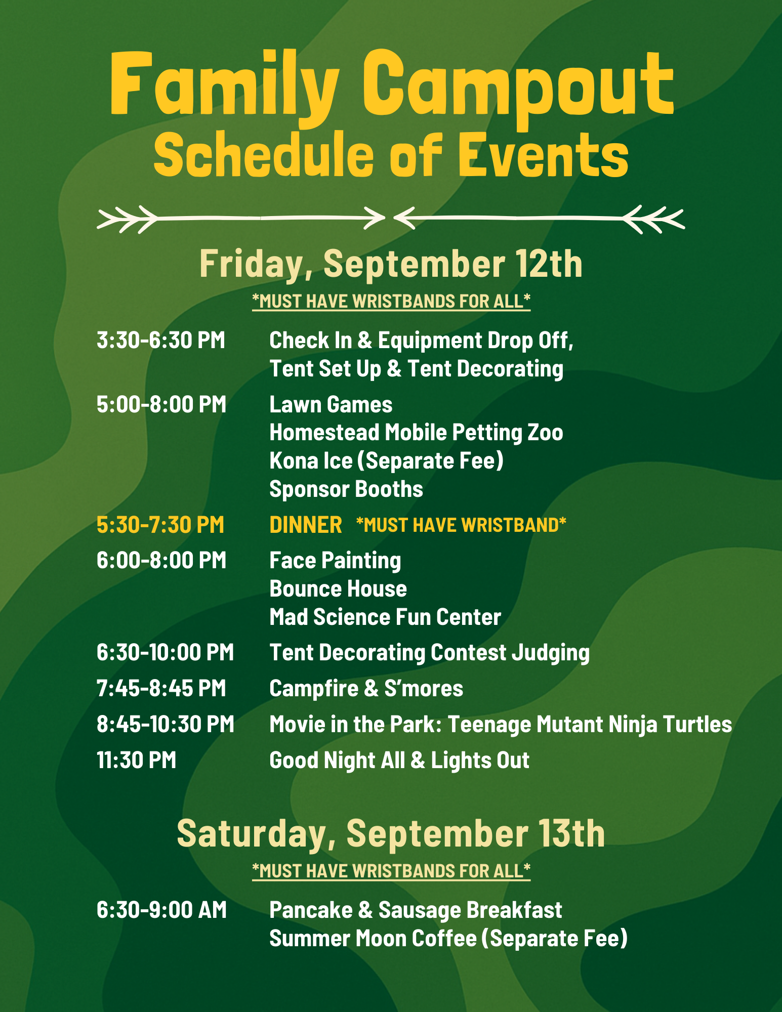 Please note: This year’s event will take place on the football fields next to Yonders Point. There are no trees in this area, so the camping space will not have shade. Please plan accordingly.