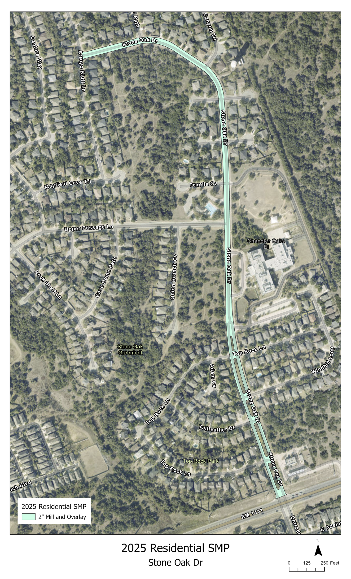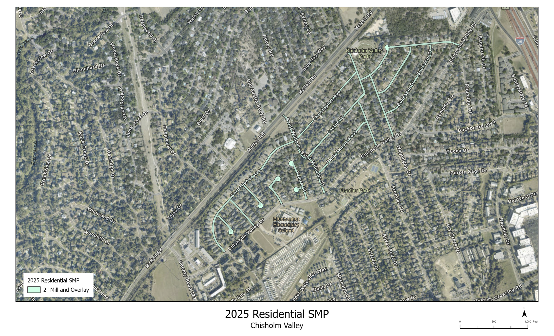 The $4.4 million contract with Lone Star Paving will provide for repairs to several roads within the Chisholm Valley, Windy Park, Stone Oak, and Indian Ridge neighborhoods. The work includes milling and new asphalt overlay, pavement patching, and failed curb, sidewalk and driveway approach repairs. Projects are selected based on the structural condition of the pavement or pavement condition index (PCI).