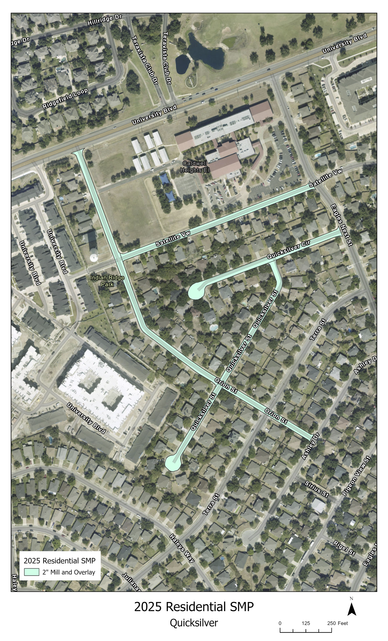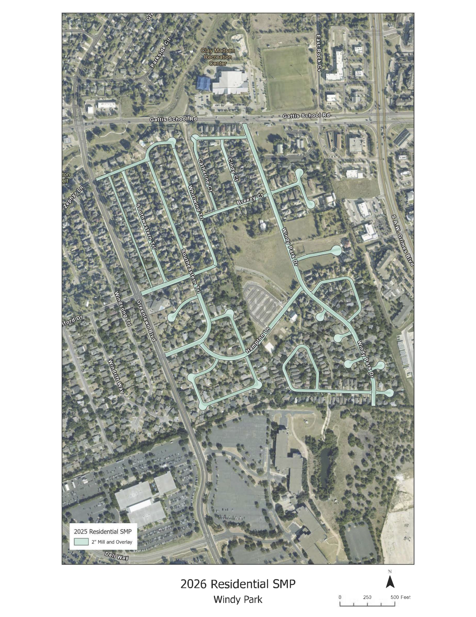 Aerial map of a residential area with highlighted light blue lines and circles showing 2025 Residential SMP areas for 2 Mill and Overlay. Streets, houses, and landmarks are visible. North arrow and scale included.