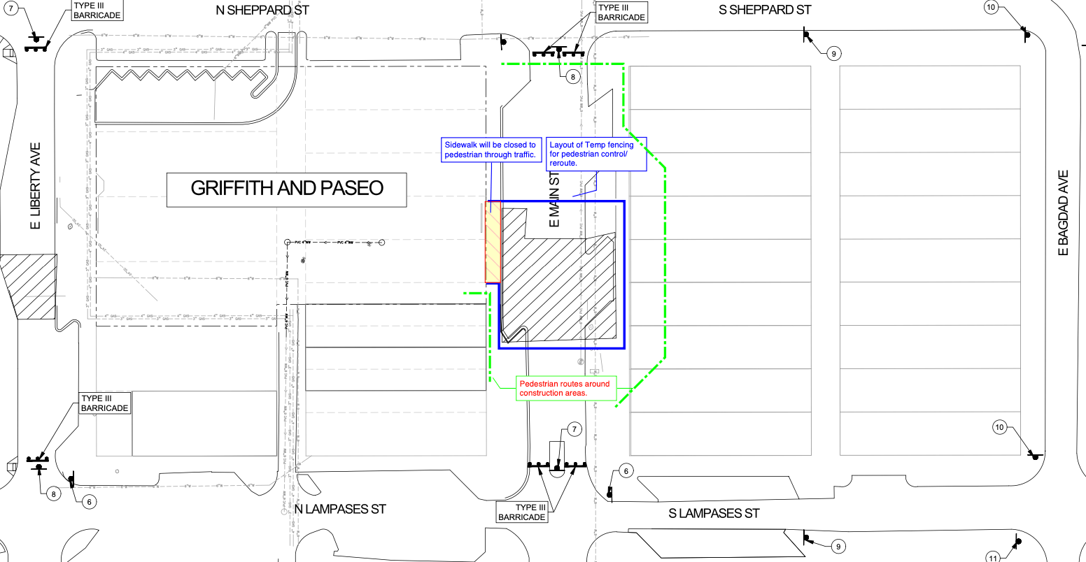Construction of a pedestrian crossing will require a one-block closure of East Main Street between Sheppard and Lampasas Streets from Feb. 17 to March 14.