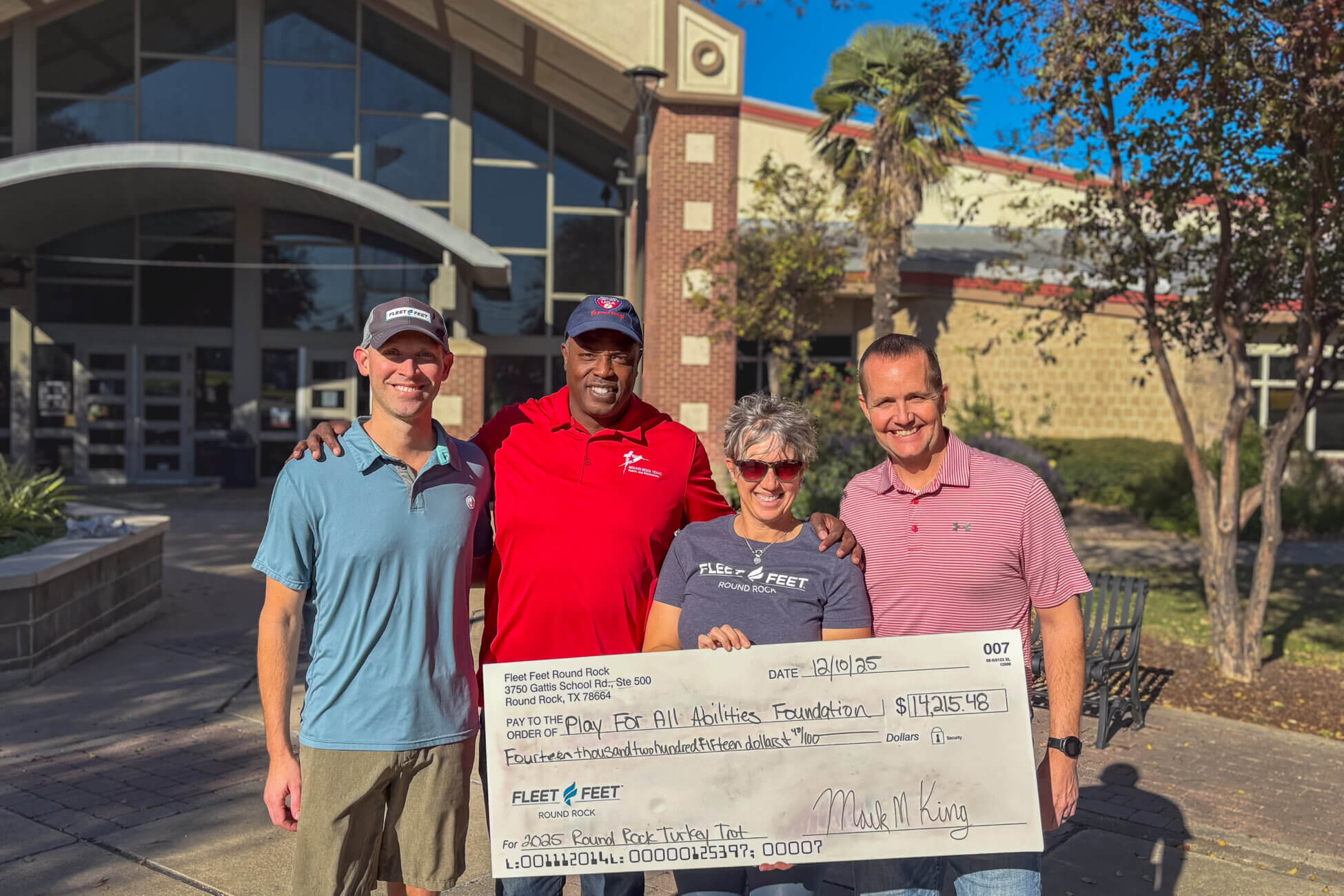 Fleet Feet of Round Rock has once again demonstrated its commitment to the community by donating a portion of the proceeds from its annual Turkey Trot to the Play for All Foundation, supporting ongoing maintenance and future enhancements at Play for All Park.