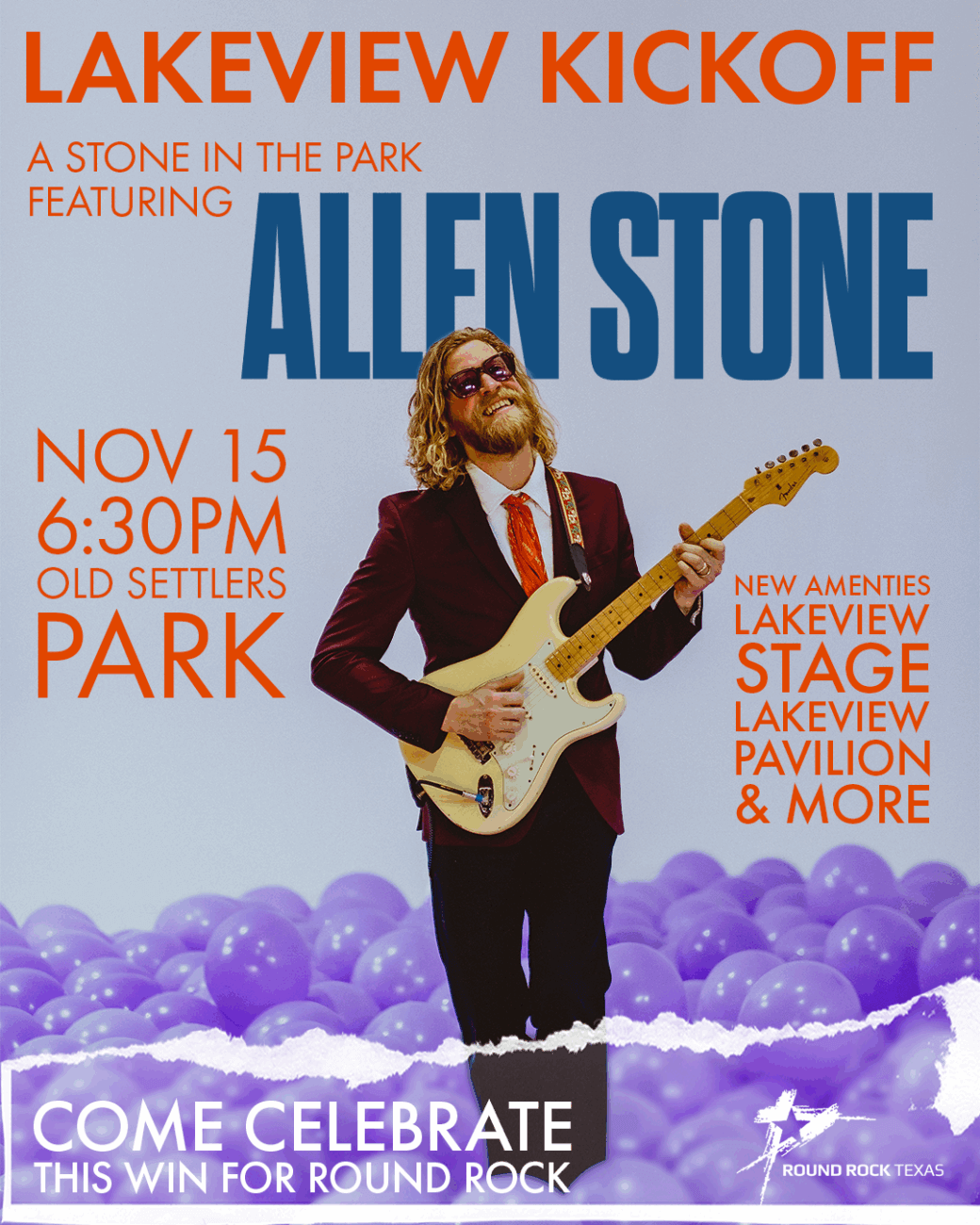 The Round Rock Parks and Recreation Department will host Lakeview Kickoff: A Stone in the Park featuring acclaimed musical artist Allen Stone at 6:30 p.m. on Saturday, Nov. 15, on the new Lakeview stage at Old Settlers Park, 3300 E. Palm Valley Blvd. The evening will also include a ribbon-cutting ceremony with Mayor Morgan and the City Council, followed by a massive fireworks finale. The pyrotechnics, originally prepared for this year’s Frontier Days celebration but postponed due to weather, will be used to create a memorable closing to the milestone event.