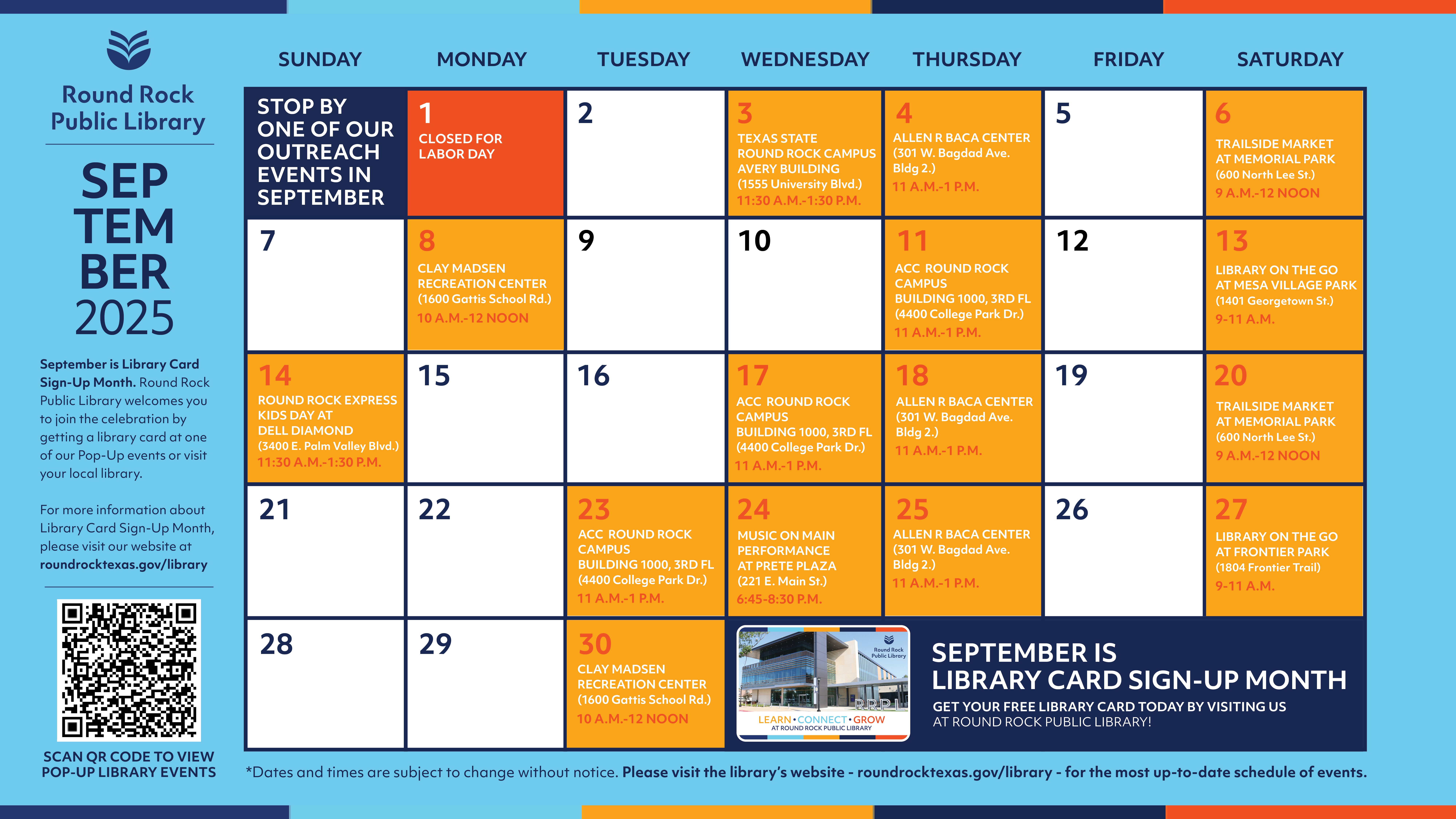 Did you know? This September, the Round Rock Public Library will be hosting local pop-up library events in Round Rock. We will be providing residents and non-residents with an opportunity to sign up for a library card without visiting the Library! Click the link below to see where we will be in the community! Download the printable flyer.