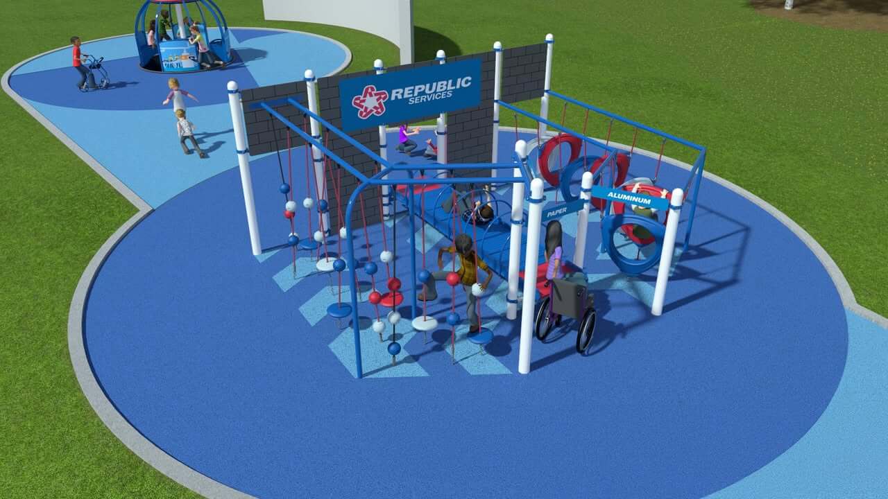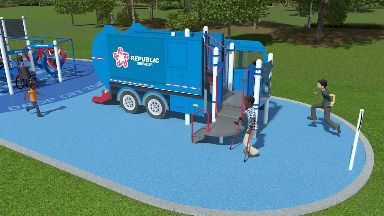 The project will include educational play features such as a recycling truck slide that feeds into sorting lanes, each designed to teach children about recycling, renewable energy and sustainability, and a wheelchair accessible merry-go-round themed with educational graphics.