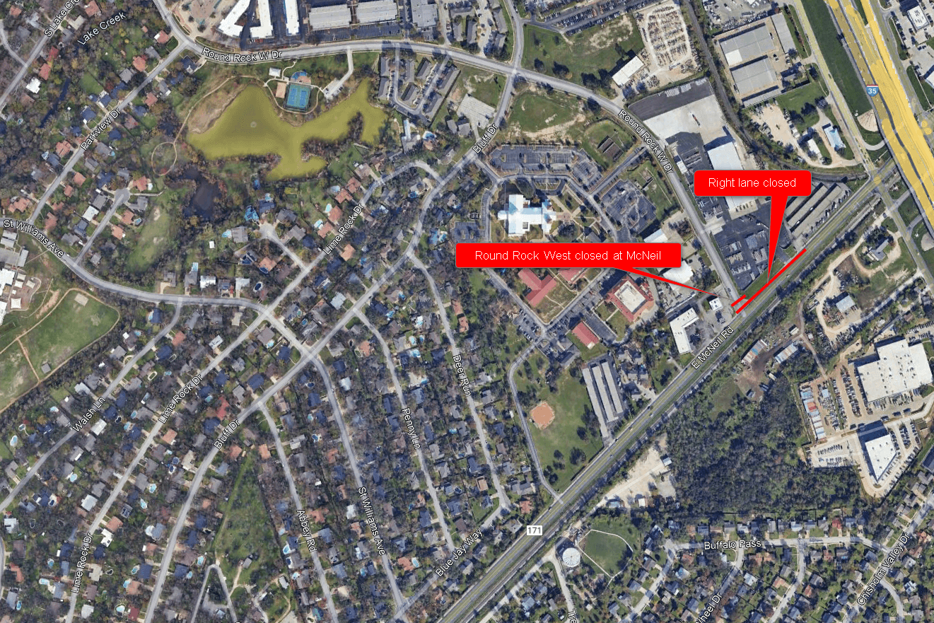 With all lanes of Round Rock West Drive closed at the McNeil intersection, southbound traffic will be detoured onto Bluff Drive, while northbound traffic will be detoured to St. Williams Avenue.