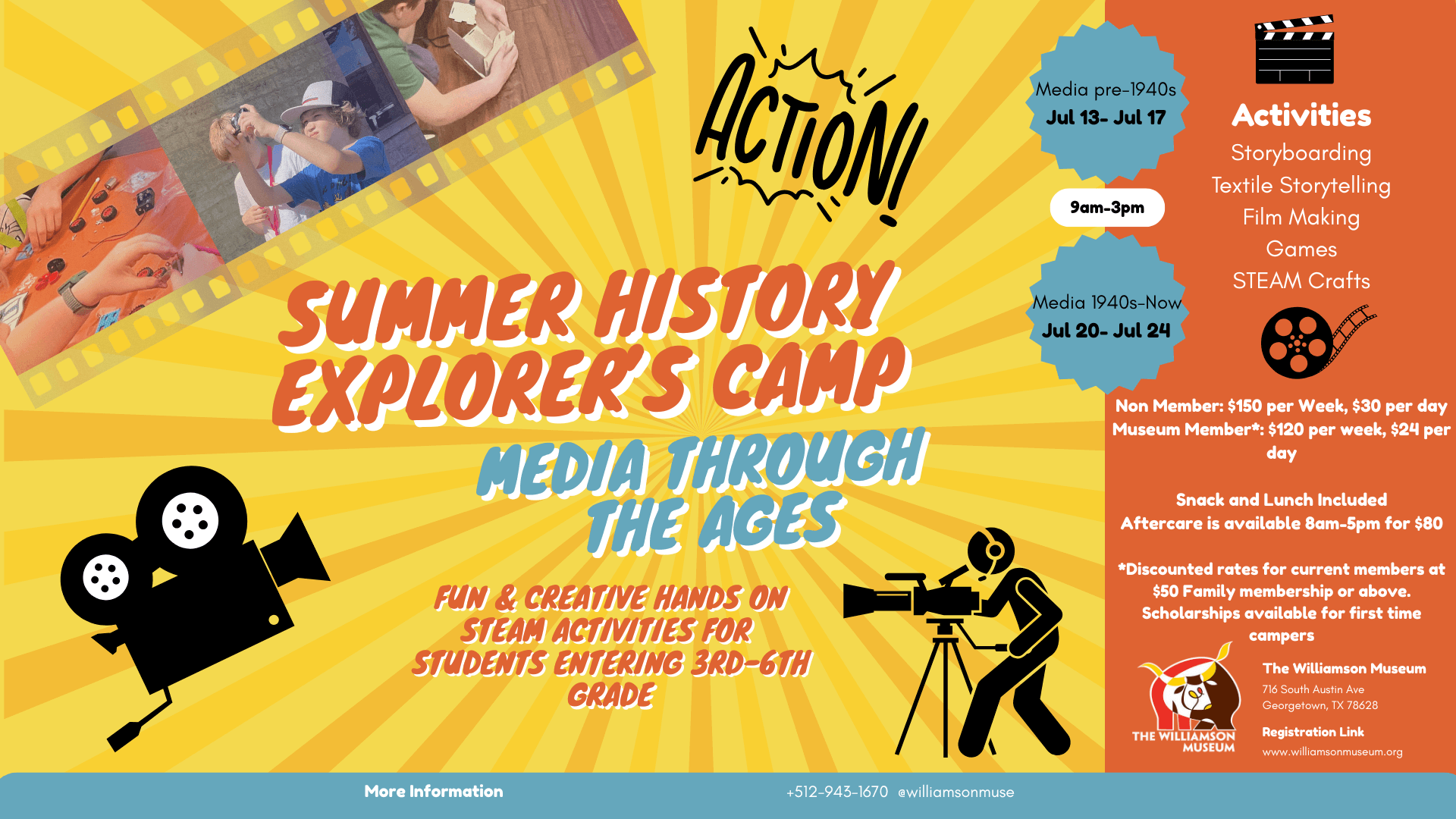 This summer, young explorers are invited to step behind the scenes of Williamson County’s Media through the Ages. Through hands-on activities and behind-the-lens experiments, campers will uncover how hometown newspapers, radio pioneers, early TV studios, and even textile-based communication shaped our community’s stories. From creating their own film scripts and designing bold headlines to experimenting with textile media such as printed fabrics, and pattern-based storytelling, participants will experience the many ways people have shared information across time. This dynamic, creativity-sparking camp offers curious kids a fresh, interactive path into both media history and the art of communication.