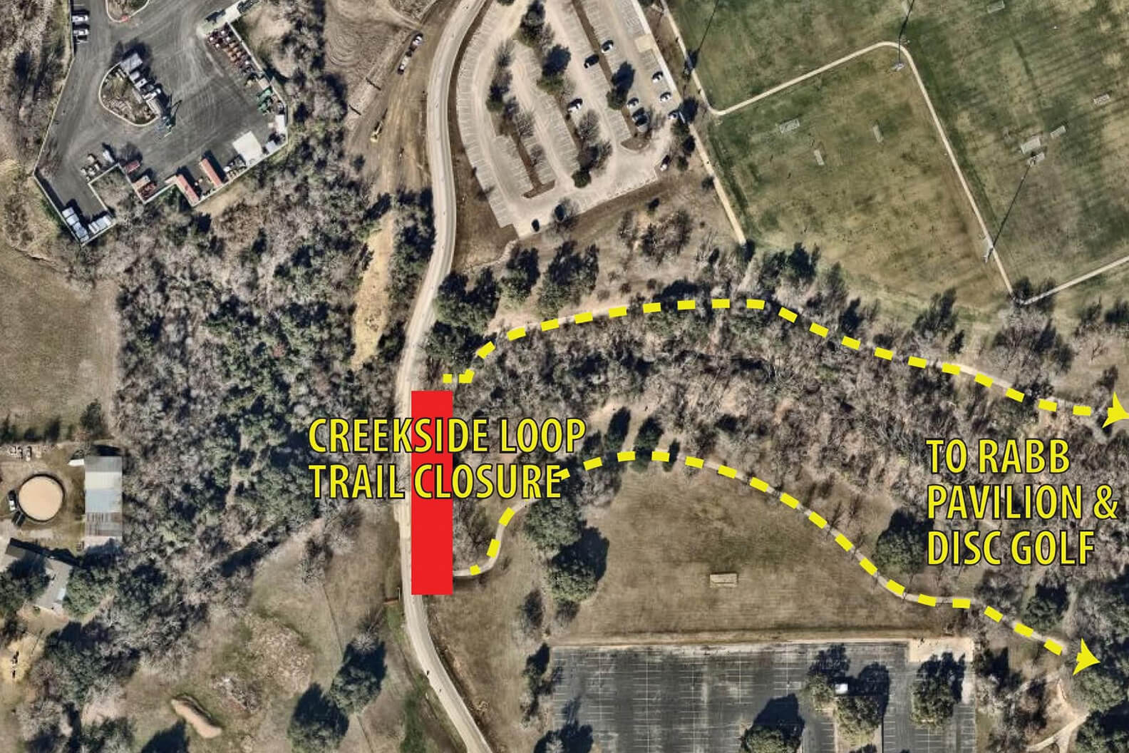 A portion of the Creekside Loop Trail at Old Settlers Park has been closed temporarily due to construction related to the Harrell Parkway road project.